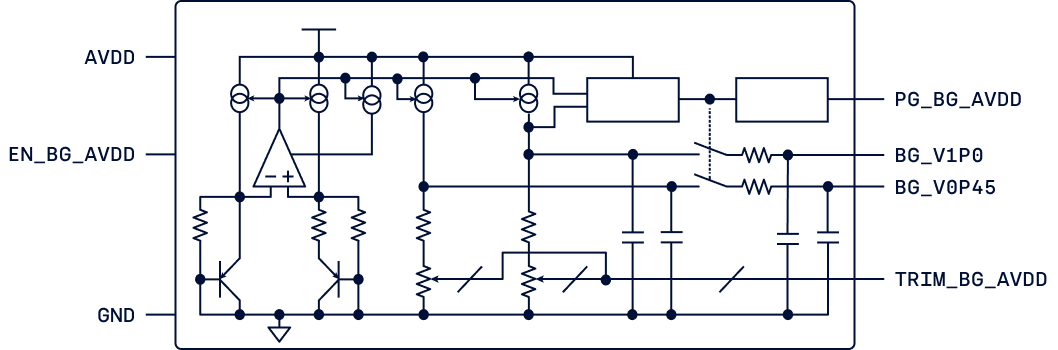 Ultra low-power bandgap with excellent PSRR, extended temperature range, precision trimming, robust PG and smooth start-up.